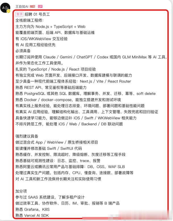 换言之,王自由要寻找的不是一个单纯的代码编写者,而是一个能够练习独霸谎言语模子、将其视为基础责任话语的“AI行使工程师”,在这个招聘设定里,AI不再是扶植编程的器具,而是重构悉数这个词责任流的坐褥力基石。