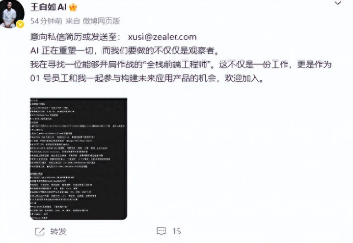 前几天,王自由通过酬酢平台发布了一则招聘缘由,为其新创业表情招募“01号全栈前端工程师”,并明确将创业标的指向了“面向畴昔的AI行使产物”。