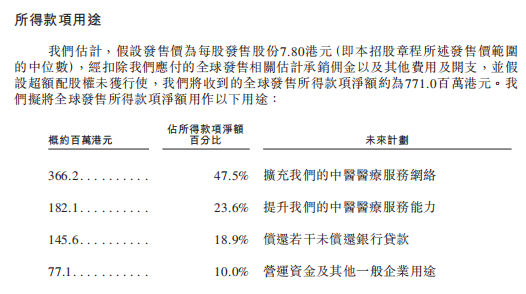 这次上市,公司蓄意将所得款项净额的47.5%(约3.66亿港元)用于推广中医医疗就业收罗,通过并购整合与轻财富新建,进一步完善宇宙布局,巩固龙头地位。