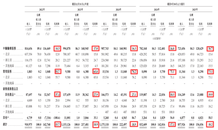 中医医疗就业四肢压舱石,2022-2024年收入分别达8.15亿元、9.95亿元、9.88亿元,终年占据超梗概营业收入,2025年前三季度进一步增至7.23亿元,中枢病院孝顺巩固,门诊东说念主次执续泉源。