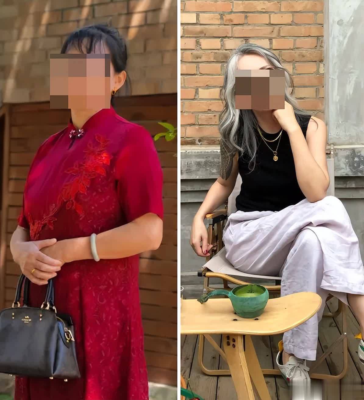 比如这组对比,左边黑发的中年女性,其穿搭和打扮已突出许多同龄东谈主,关系词在她身上,咱们感受到的并非自信,而是一种略显拧巴的表情。