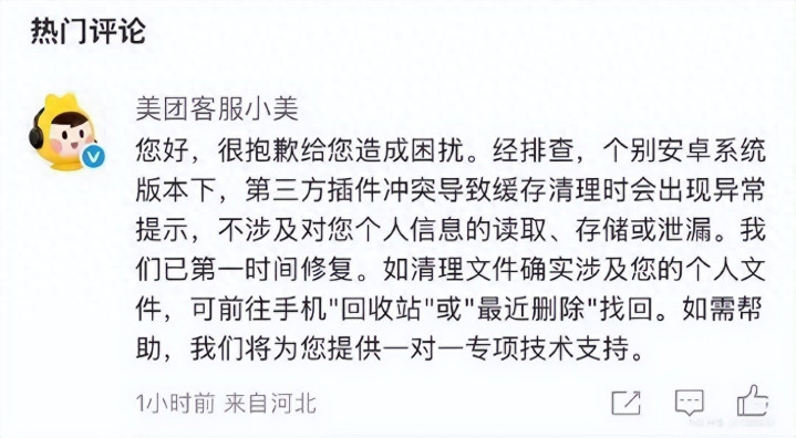 3月20号,好意思团客服小好意思在微博辩论区酬谢:第三方插件冲破导致缓存计帐特地,不波及个东谈主信息的读取、存储或表露,已第一期间开导。